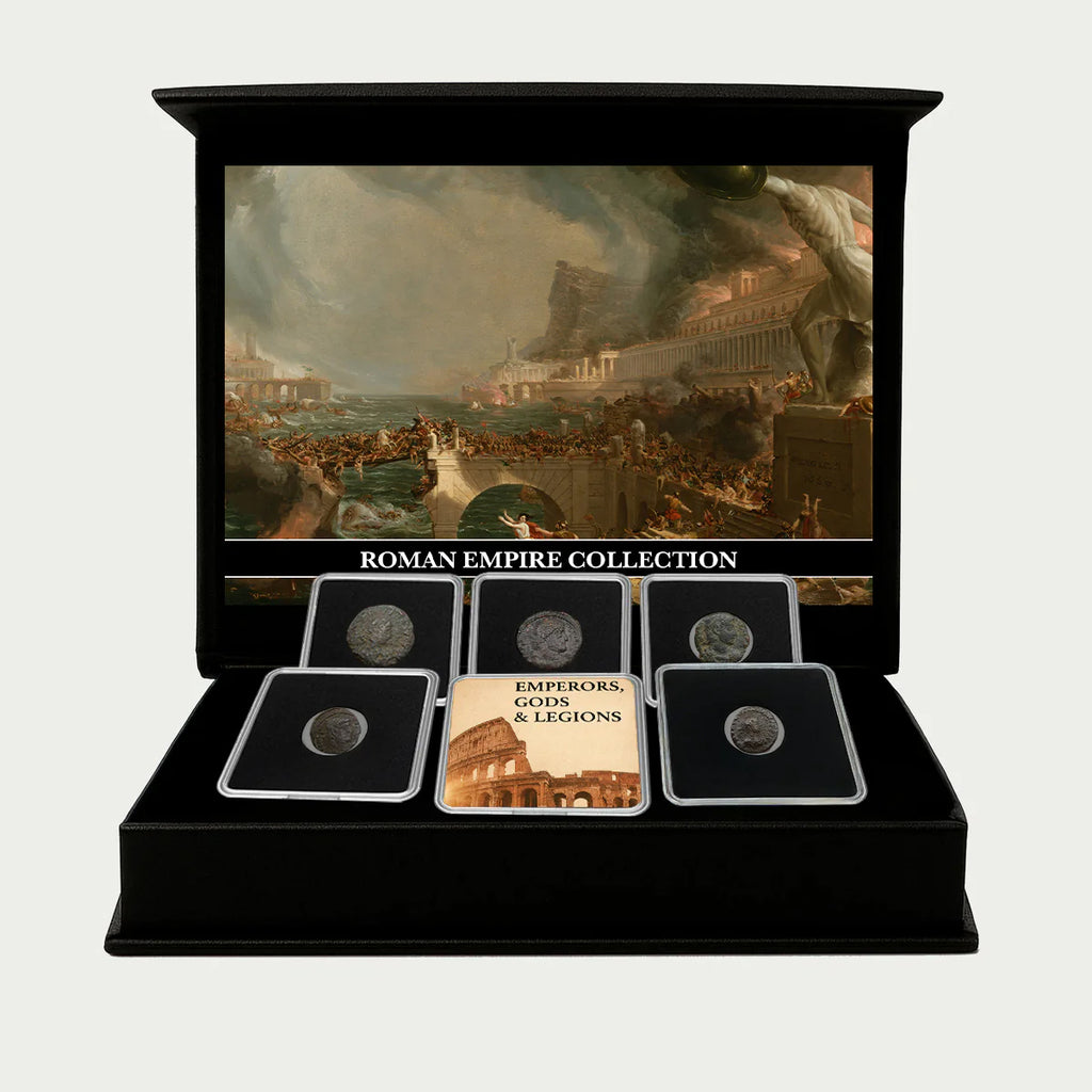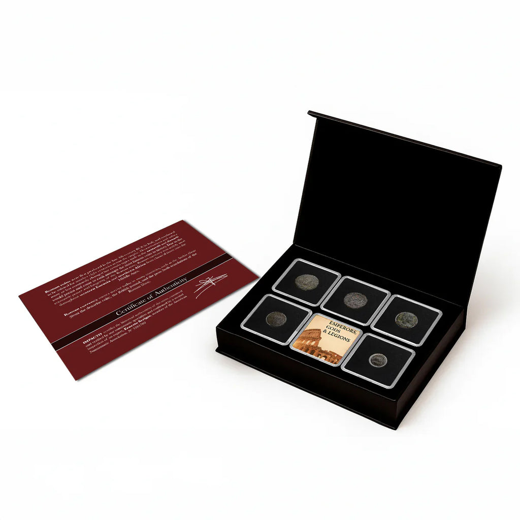 Spüren Sie die Macht des Imperiums in Ihren Händen mit dieser einzigartigen Sammlung von 5 originalen Münzen aus dem Römischen Reich, zertifiziert und zur Aufbewahrung gekapselt. Diese zwischen 300 und 400 n. Chr. geprägten authentischen Münzen stehen in direkter Verbindung zu legendären Kaisern, Symbolen des Sieges, römischen Göttern und den Legionen, die den Lauf der Geschichte geprägt haben.