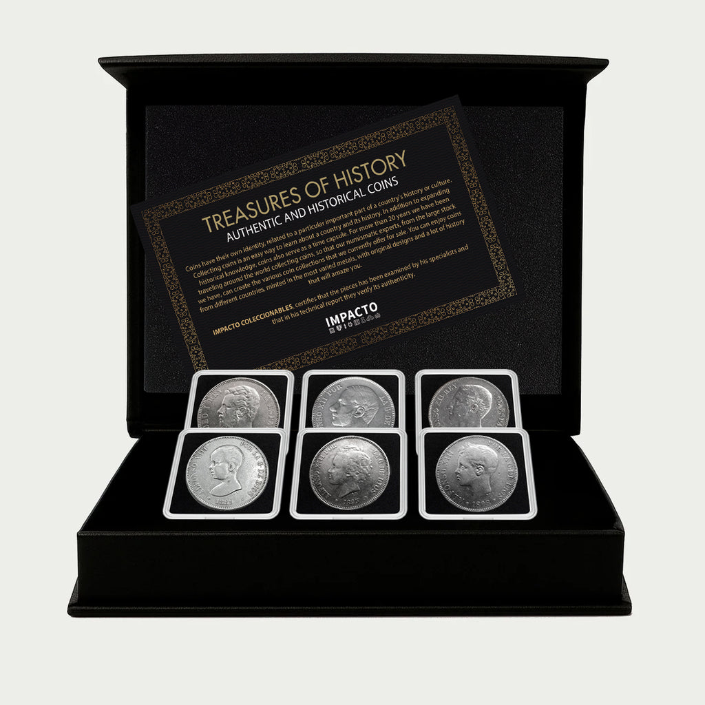 Relive the history of Spain with this complete collection of 6 authentic 5 peseta coins, minted in sterling silver (900‰) between 1871 and 1912, during the reigns of Amadeo I, Alfonso XII (with and without beard) and Alfonso XIII (the Bald, with curls and the Cadet).