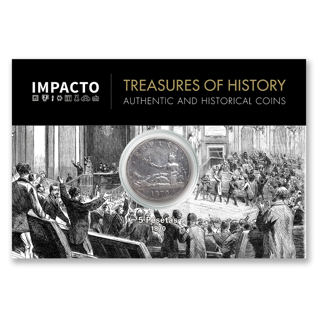 Moneta originale da 5 pesetas del 1870 in capsula e blister con certificato
