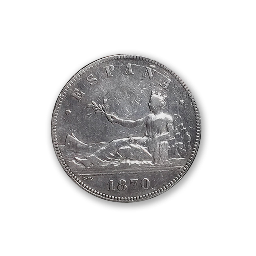 Origine storica autentica: coniata nel 1870 sotto il governo provvisorio prima della proclamazione della Prima Repubblica. È una delle monete più emblematiche della numismatica spagnola del XIX secolo.