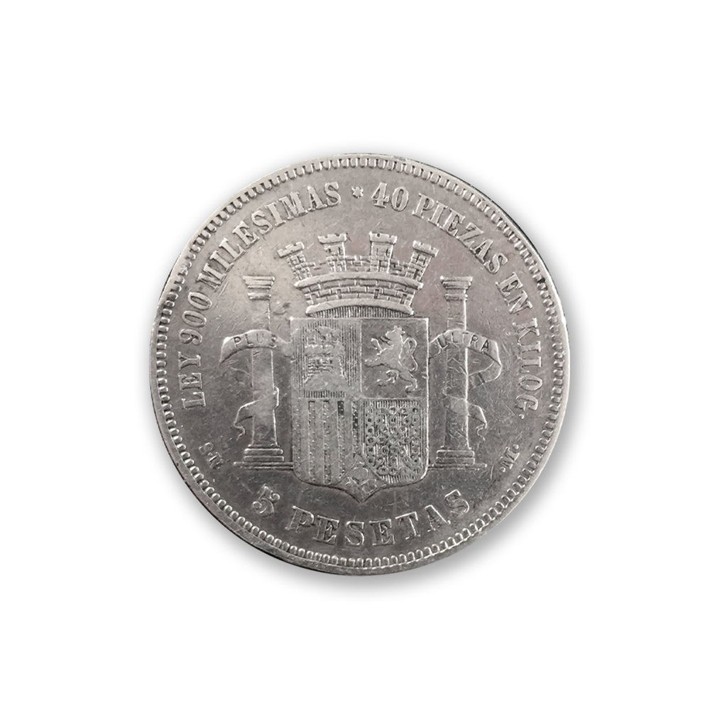 Disegno e simbolismo nazionale: Sul dritto appare la figura allegorica dell'Hispania sdraiata e sul rovescio lo scudo nazionale con la leggenda SOBERANIA NACIONAL sul bordo. Valore di 5 pesetas, legge 900 millesimi, 25 g e 37 mm.