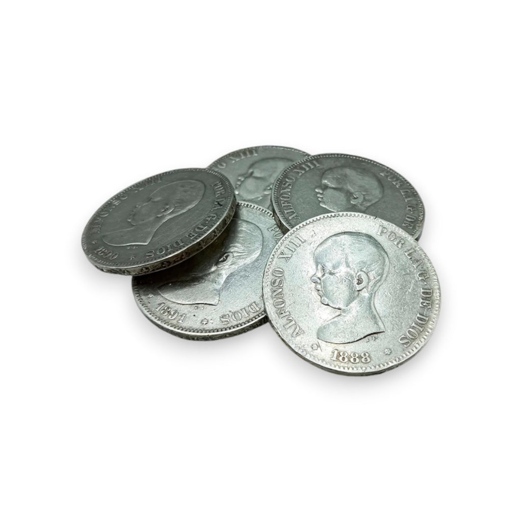 Disegno del re bambino: Il dritto mostra il piccolo Alfonso XIII con la testa rasata, simbolo di innocenza e continuità dinastica. Il rovescio include lo stemma della Spagna e la scritta 5 PESETAS.