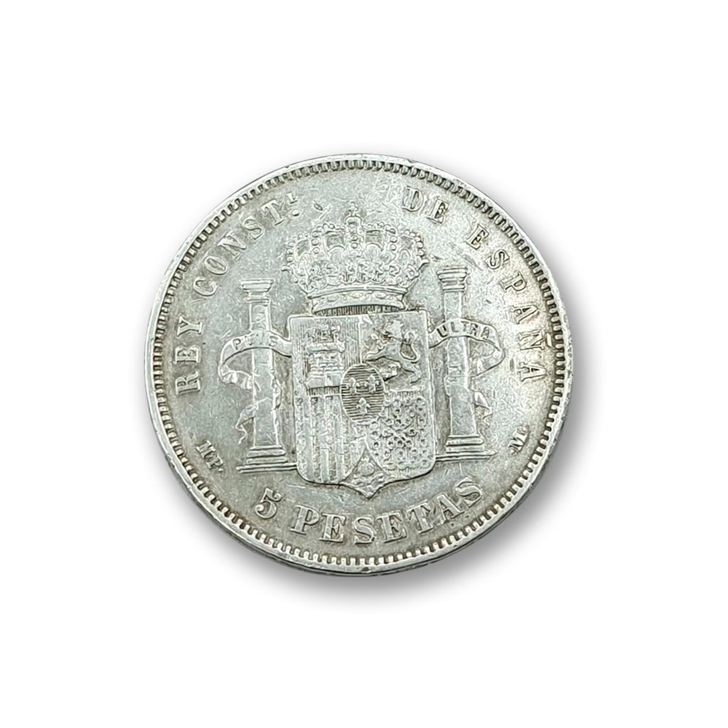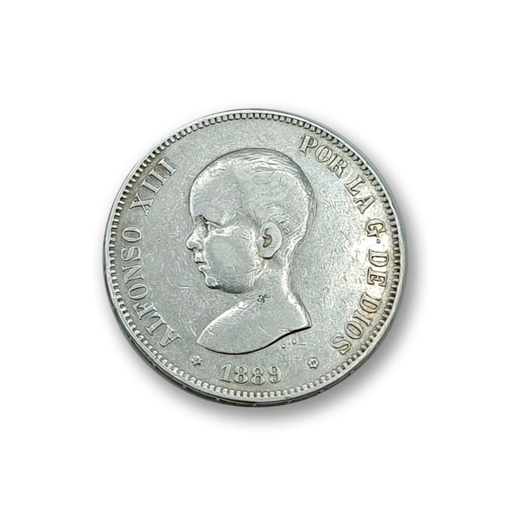 Rivivi la storia della monarchia spagnola con questa autentica moneta da 5 pesetas, coniata tra il 1888 e il 1892 durante l'infanzia del re Alfonso XIII.