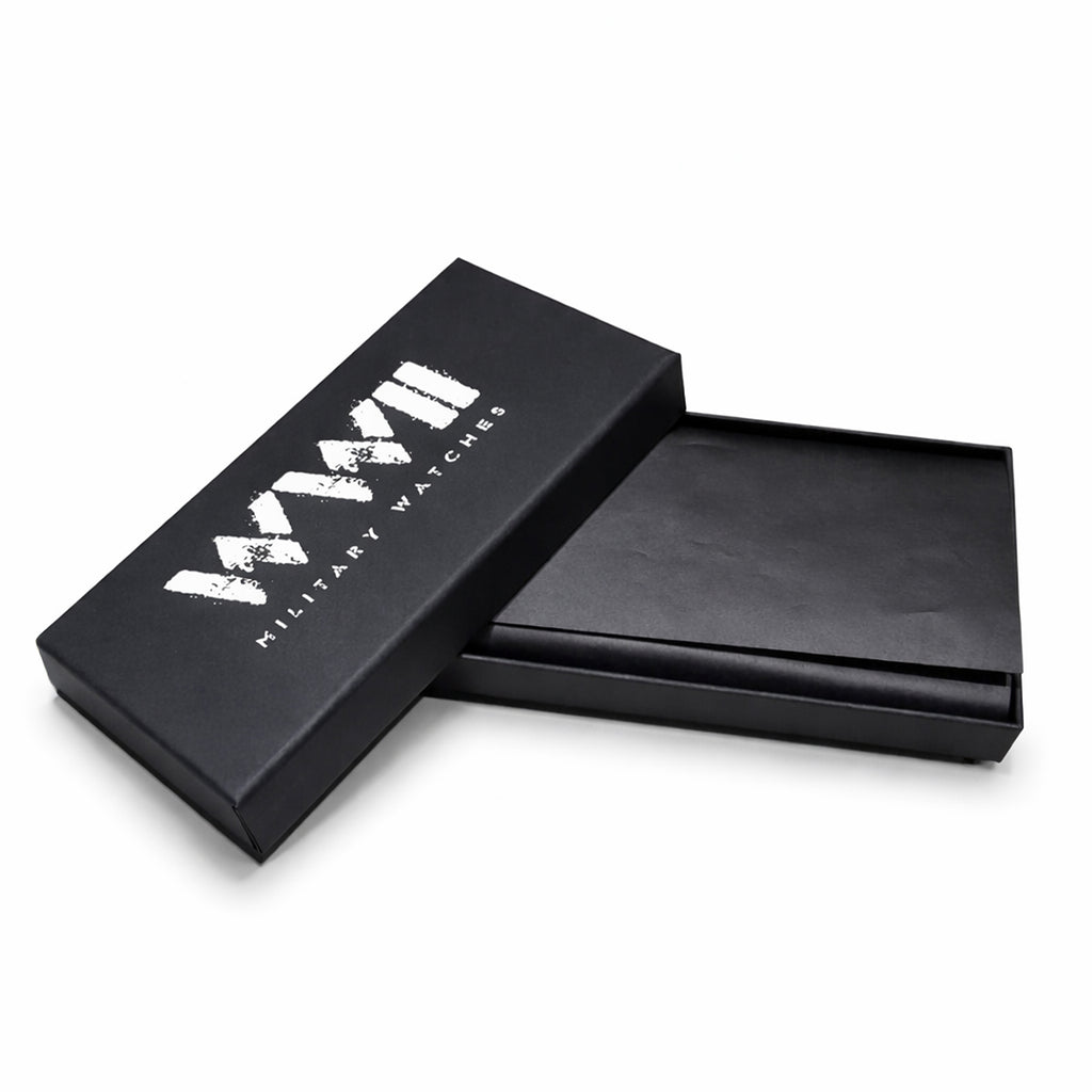 - Cassa in lega di zinco di alta qualità, 43 mm, finitura opaca. La cassa originale dell'orologio era di 55 mm (per uso piloti, sopra le maniche), ma è stata ridotta per rendere l'orologio più facile da indossare oggi.