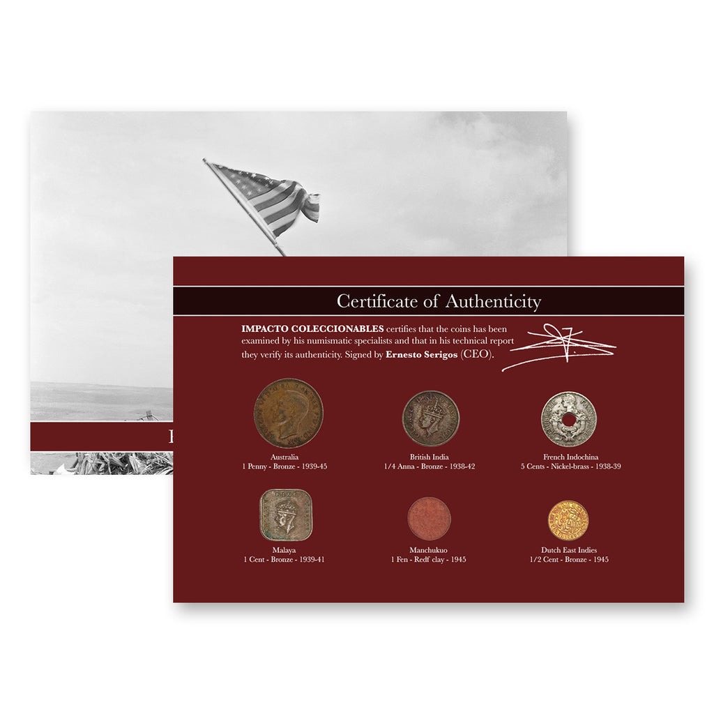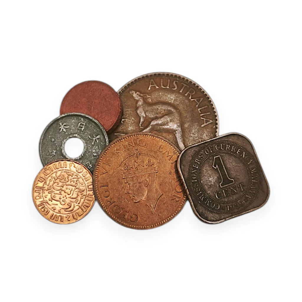 🌏 Sostén un pedazo de historia con este conjunto original de 6 monedas utilizadas durante la Segunda Guerra Mundial en el Frente del Pacífico. Acuñadas entre 1938 y 1945 por países ocupados por Japón o activamente involucrados en el conflicto del Pacífico, estas monedas nos conectan con vidas reales e historias de guerra no contadas.