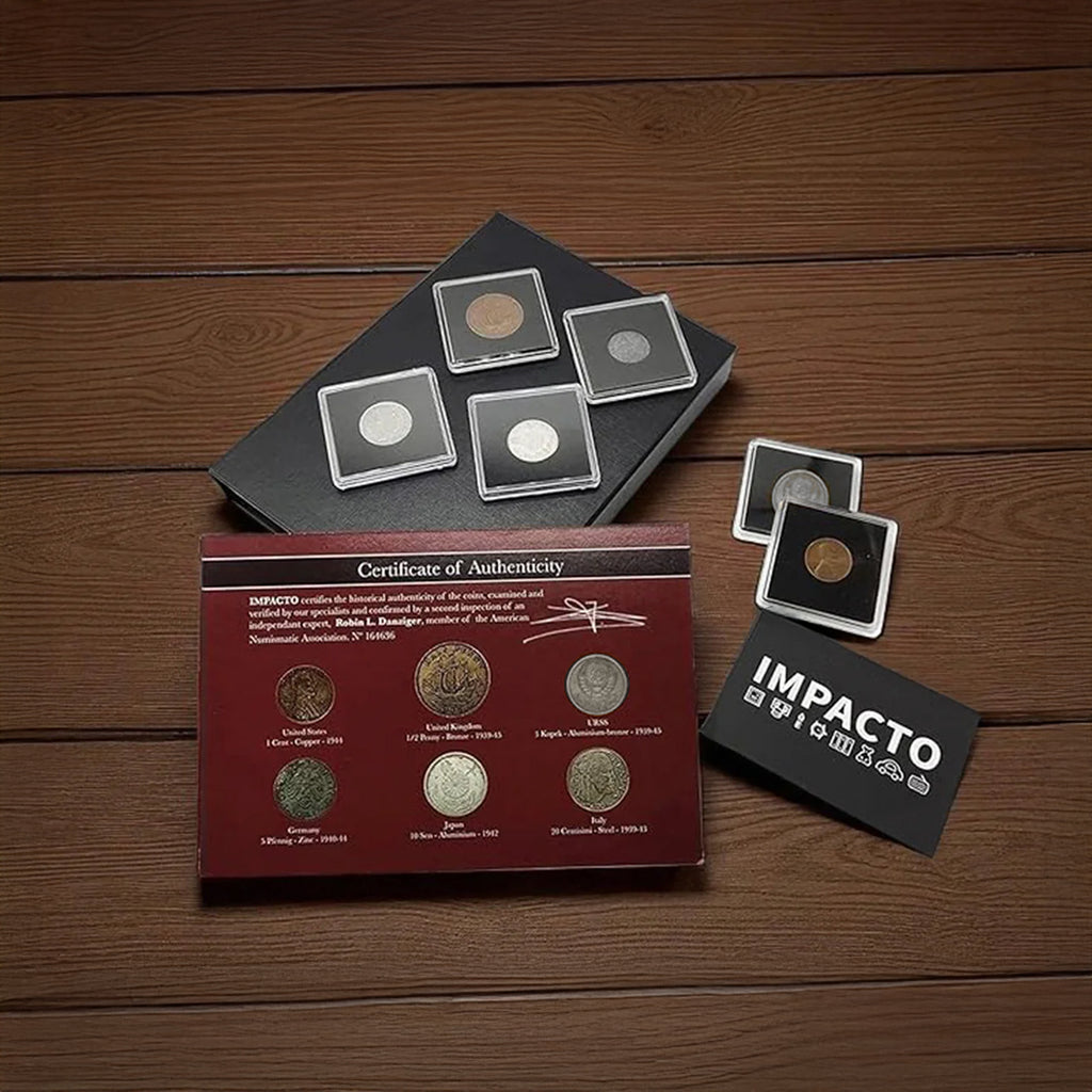 Experimenta la esencia tangible de la Segunda Guerra Mundial con esta colección exclusiva de 6 monedas auténticas, acuñadas entre 1939 y 1945 por países de ambos bandos del conflicto: Aliados y Eje. Este extraordinario conjunto te conecta con vidas reales e historias no contadas de una era que definió la historia humana.