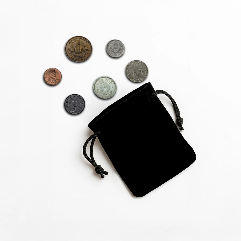 Colección de 6 Monedas Auténticas de la Segunda Guerra Mundial | Aliados & Eje en Bolsa de Terciopelo (1939-1945)
