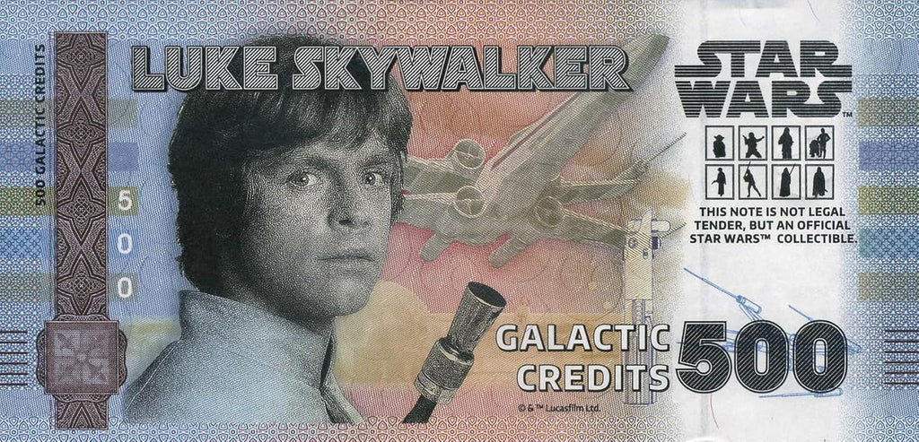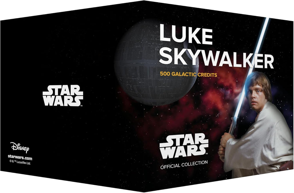 Este billete presenta un diseño vertical en el anverso y horizontal en el reverso, incorporando elementos icónicos asociados a Luke Skywalker, como símbolos Jedi, referencias a su entrenamiento y escenas clave de su viaje heroico. Incluye holograma dorado del logotipo Star Wars, marcas de agua, hilo de seguridad y detalles visibles bajo luz ultravioleta (UV), garantizando un acabado premium propio de una pieza de colección oficial.