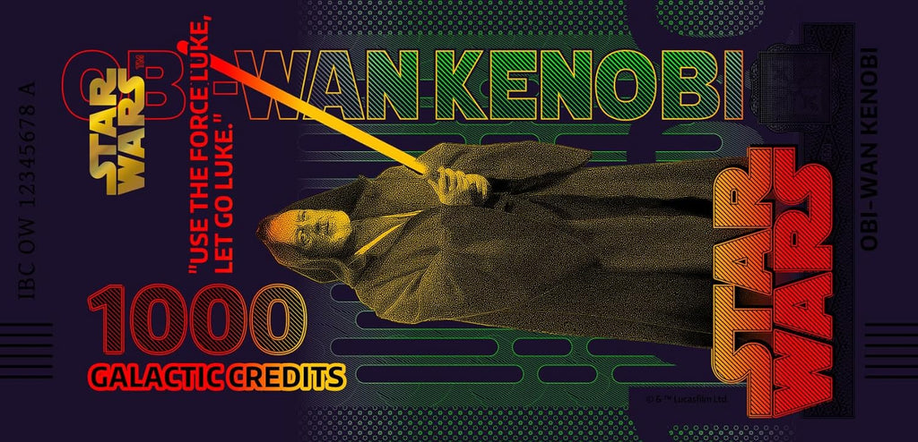 Este billete presenta un diseño vertical en el anverso y horizontal en el reverso, integrando elementos icónicos asociados a Obi-Wan Kenobi, como símbolos Jedi, escenas legendarias y referencias visuales clave de la saga. Incorpora holograma dorado del logotipo Star Wars, marcas de agua, hilo de seguridad y detalles visibles bajo luz ultravioleta (UV), garantizando un acabado premium y una presentación digna de colección oficial.